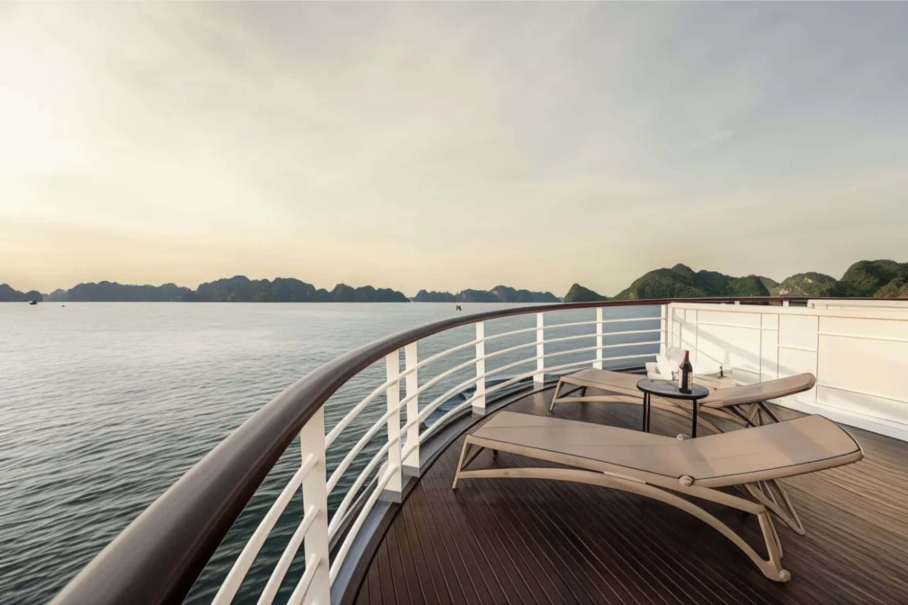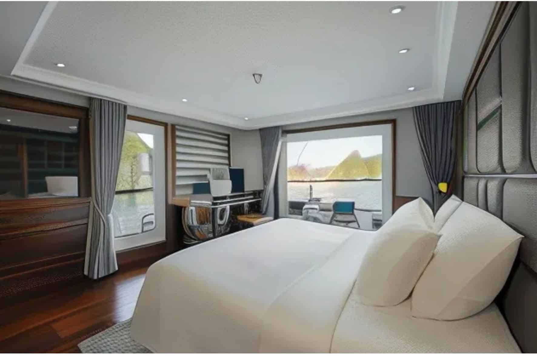 位於船頭二樓提供最先進的設施、帶浴缸的套間浴室以及可欣賞海灣壯麗景色的私人露