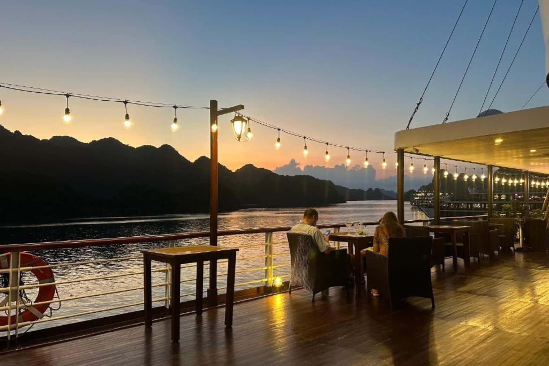 pm 20.30 晚餐後,在甲板上欣賞海灣寧靜的夜景。客人可以參加晚間活動:放鬆按摩(收費)、日光浴平台草藥足浴(1間客房免費1份草藥套餐)。聽音樂,在Sky Bar喝一杯,看下龍灣夜景,釣魷魚船停泊在度假勝地的一個安靜區域。