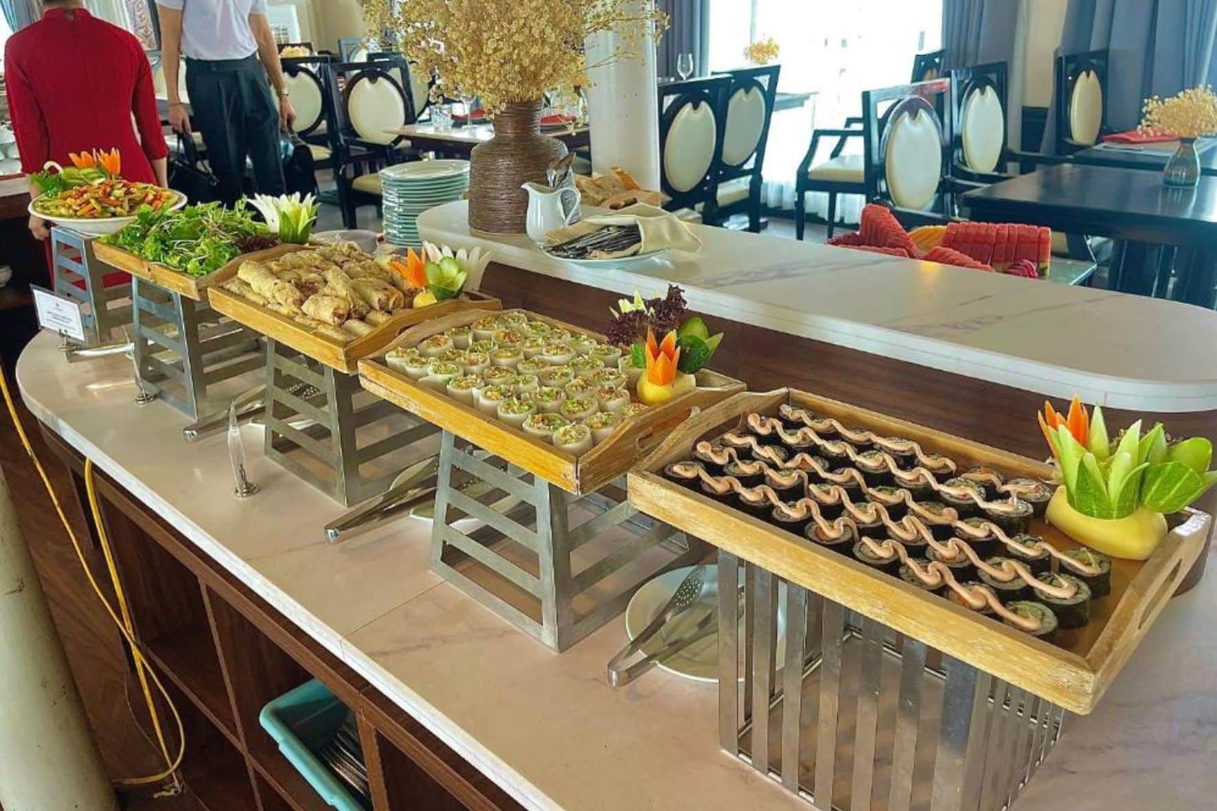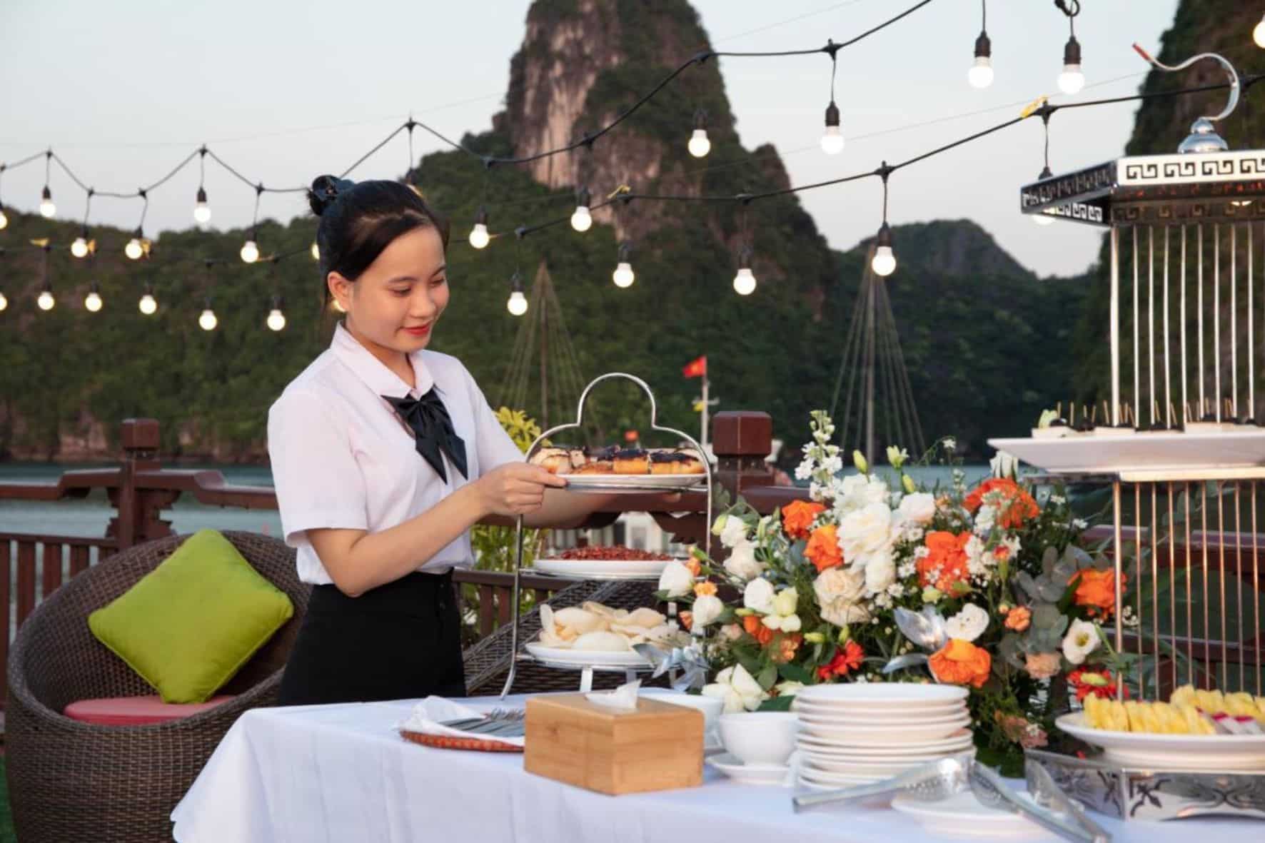 pm 17:30-18:30 客人返回船上參加兩項活動:日落派對和船上返岸途中的烹飪課。 客人可以在美妙的自然空間的日光浴平台上品嚐傳統的越南茶或咖啡,欣賞日落,享受輕鬆的時刻。白天的下龍灣本來就安靜、溫柔,但當日落開始暗淡地平線時,它變得更加溫柔、和平。