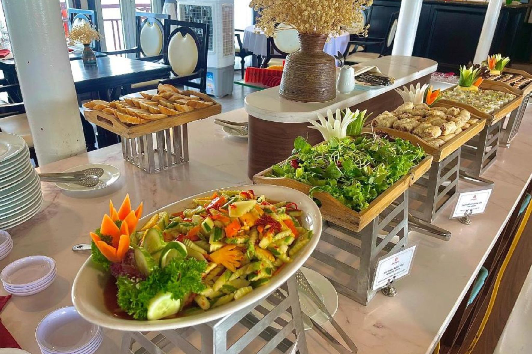 迎賓飲料和冷毛巾。茶、咖啡、瓶裝礦泉水、符合客房標準的便利設施。 04餐遊輪行程中的標準餐食/參觀驚訝洞穴的觀光門票、皮划艇門票/日光浴平台上的晚宴(視天氣情況而定)/房間內的草藥足浴。阿曼達捐贈一包草藥足浴/所有房間都有水果依菜單提供免費餐飲服務。服務時間:下午:15.00 至16.30 —晚上:21.00 至23.30。