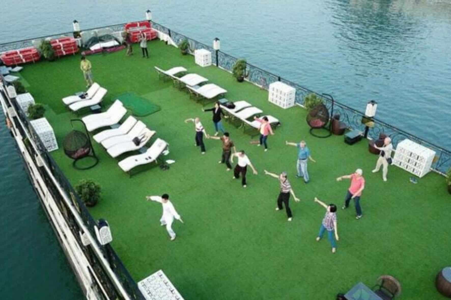 am06:00:在日光浴平台上參加太極拳課程,欣賞下龍灣日出時的壯麗景色,為您的一天預熱。