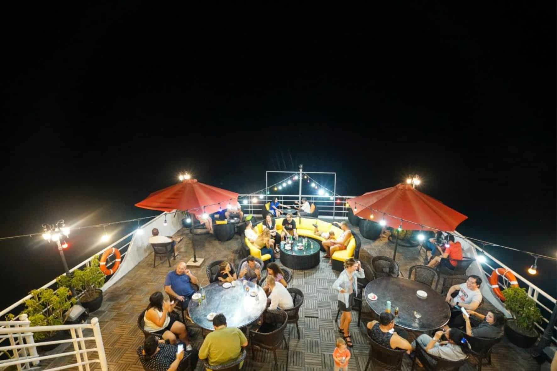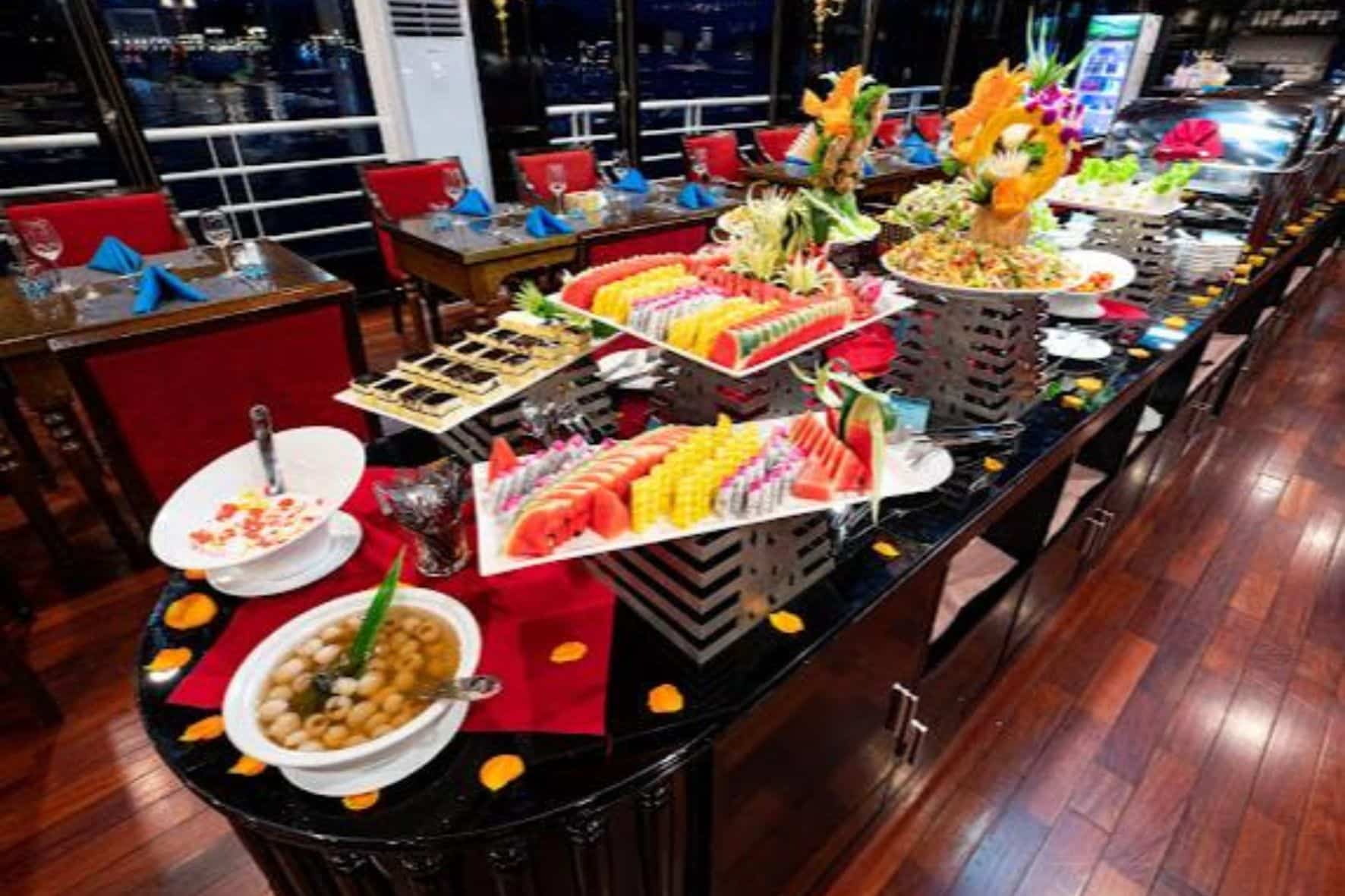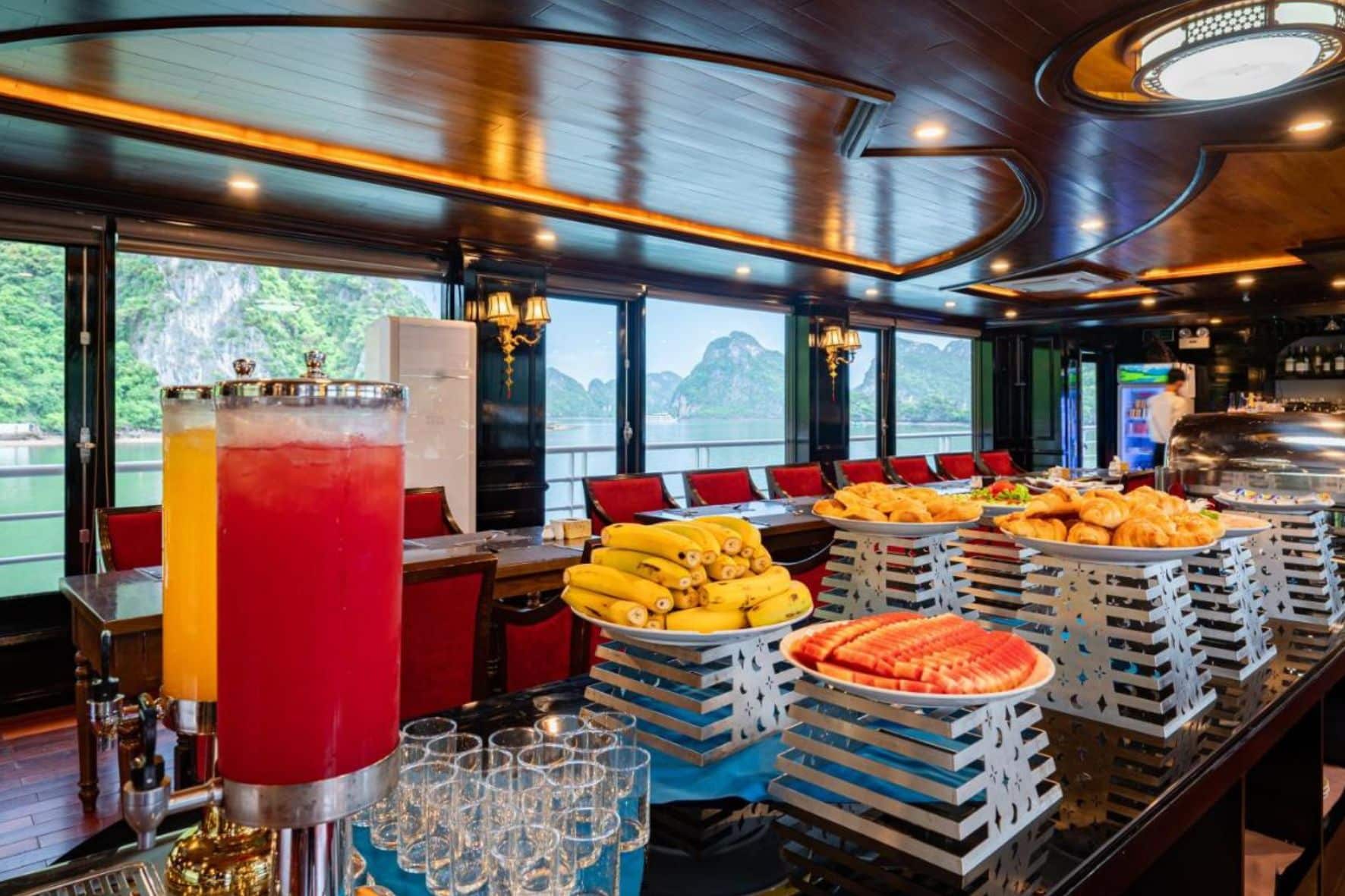 除兒童礦泉水,粥和牛奶外,請勿攜帶食物或飲料上船。若帶上船,依船上規定需加收以下附加費:烈酒:500,000 VND/1瓶,葡萄酒:350,000 VND/1瓶,鄉村酒:300,000越南盾/1公升,罐裝:20,000越南盾/1罐