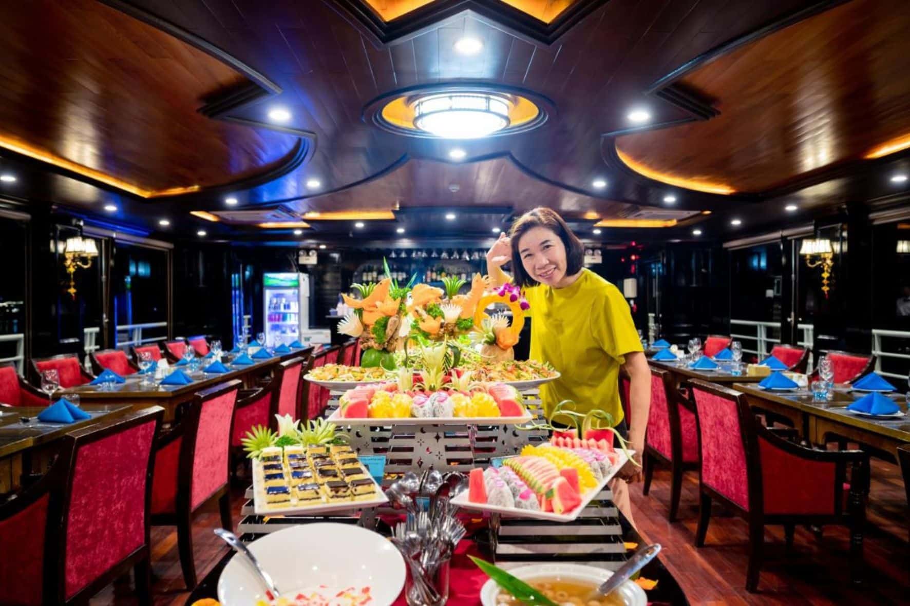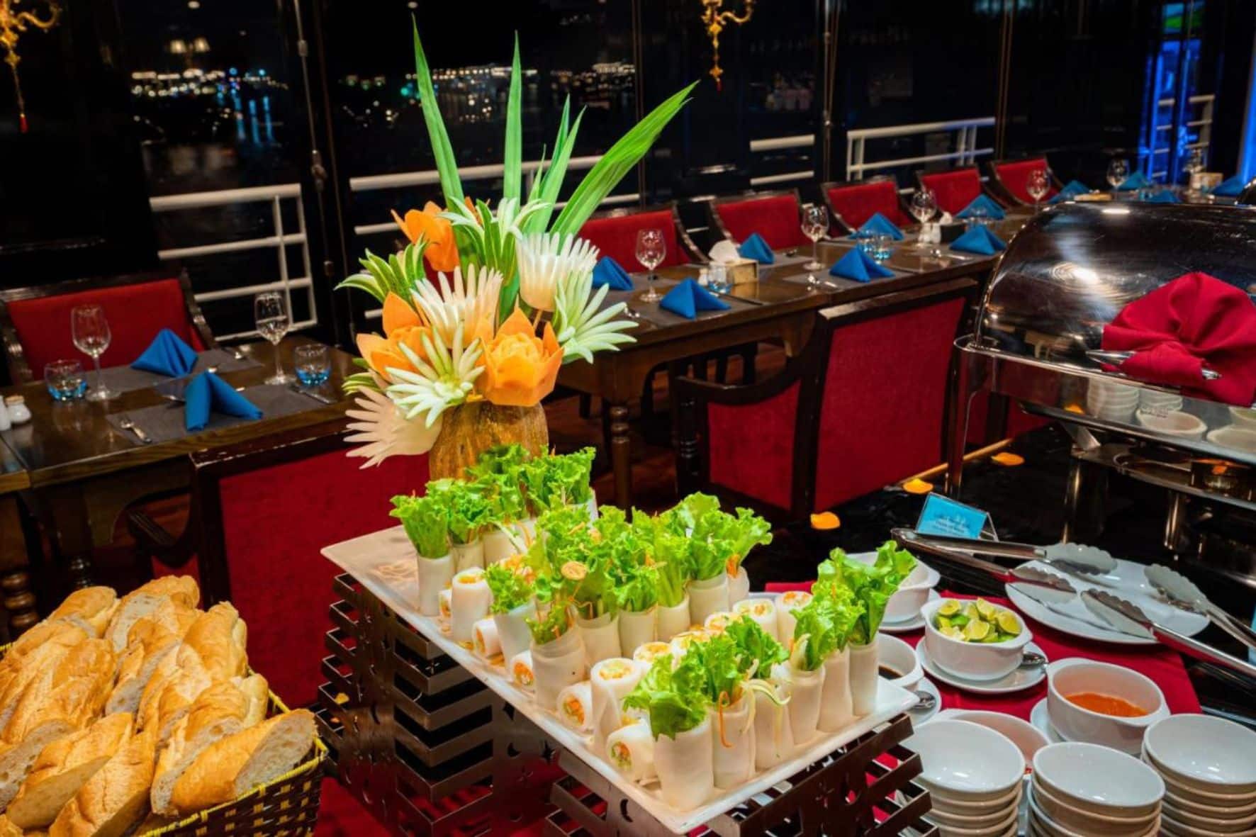 烹飪示範是一項船上活動,幫助乘客不僅可以品嚐美食,還可以更多地了解越南烹飪文化。郵輪廚師將向您展示和指導如何製作越南傳統菜餚,例如新鮮或乾的春捲和/或如何雕刻不同種類的蔬菜和水果。您可能會被邀請與其他乘客參加有趣的比賽,看看誰做飯速度最快。最後,您可以享用自己喜歡的食物,自己享用或與同伴分享。對於那些熱愛烹飪和美食的人來說,這是一項有趣的活動!晚餐前,我們經驗豐富的船長會選擇最安靜的區域拋錨過夜。