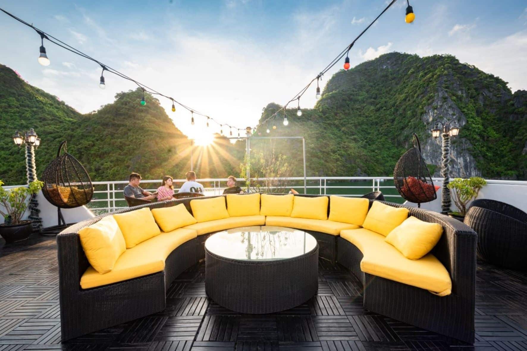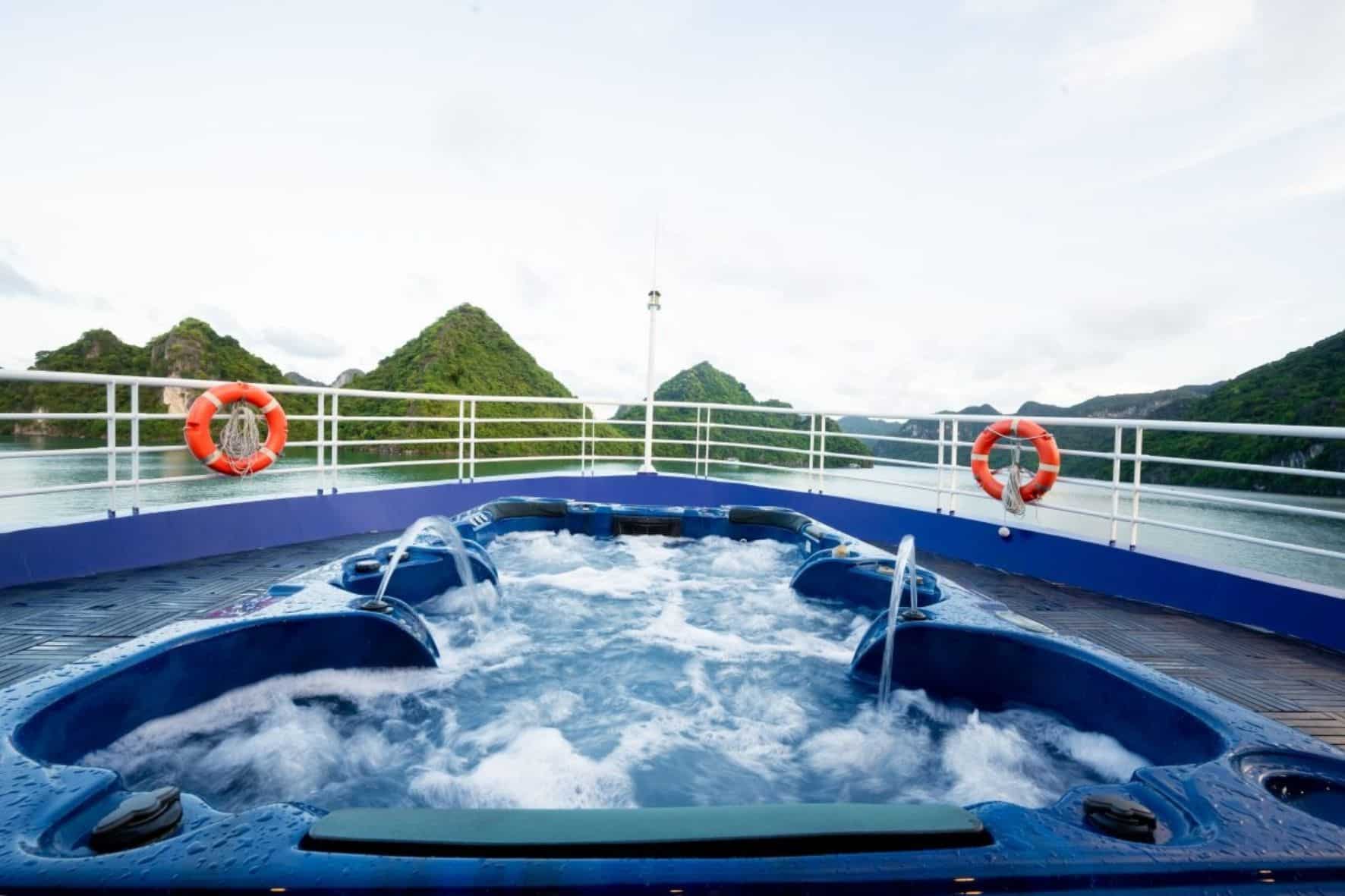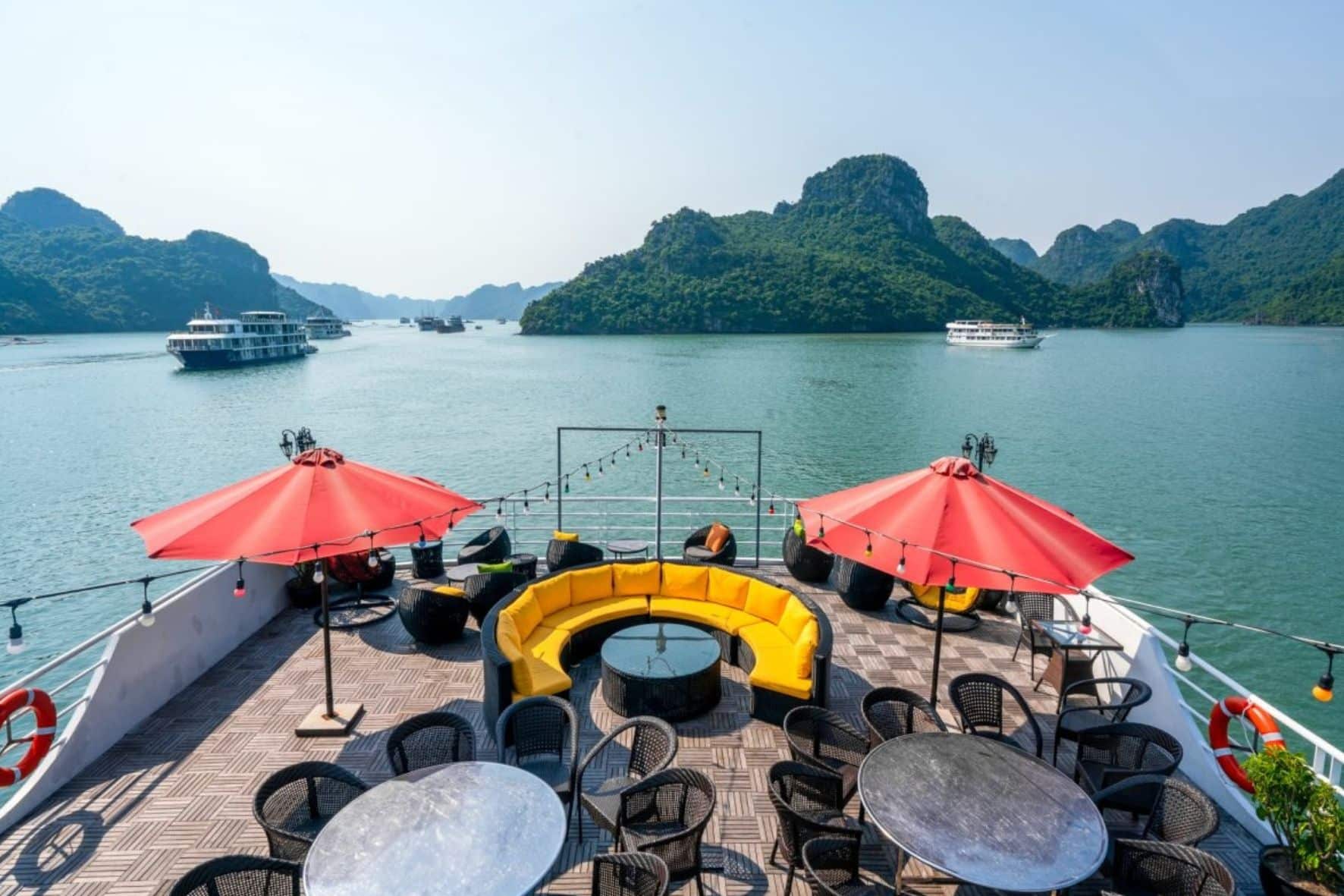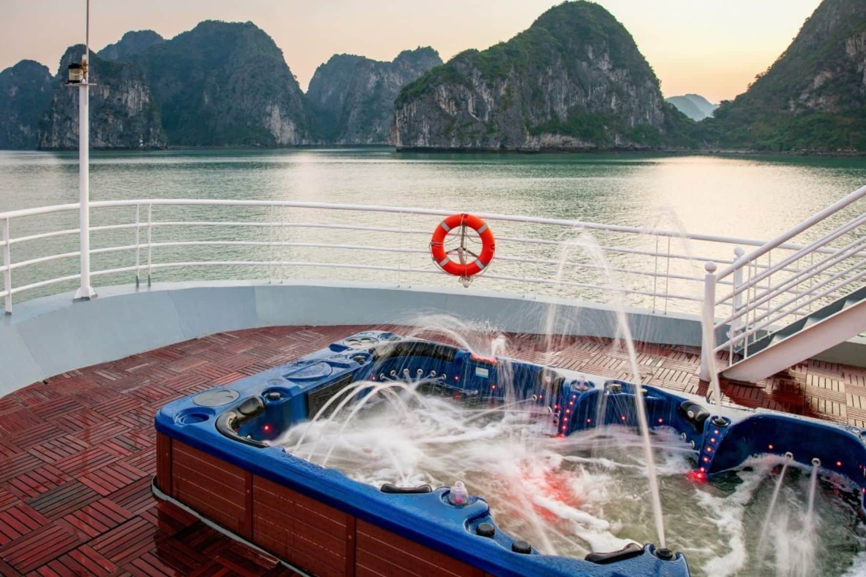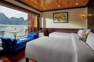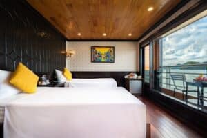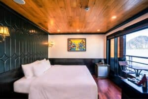 01晚入住豪華客房設有俯瞰海灣的私人陽台/行程餐點豐富,融合了歐洲和越南風味/提供過濾水,登機時提供果汁/免費卡拉OK/-預定活動:劃獨木舟或竹船探索蘭哈、游泳、在甲板上享受下午茶看日落、早安太極夜間門票